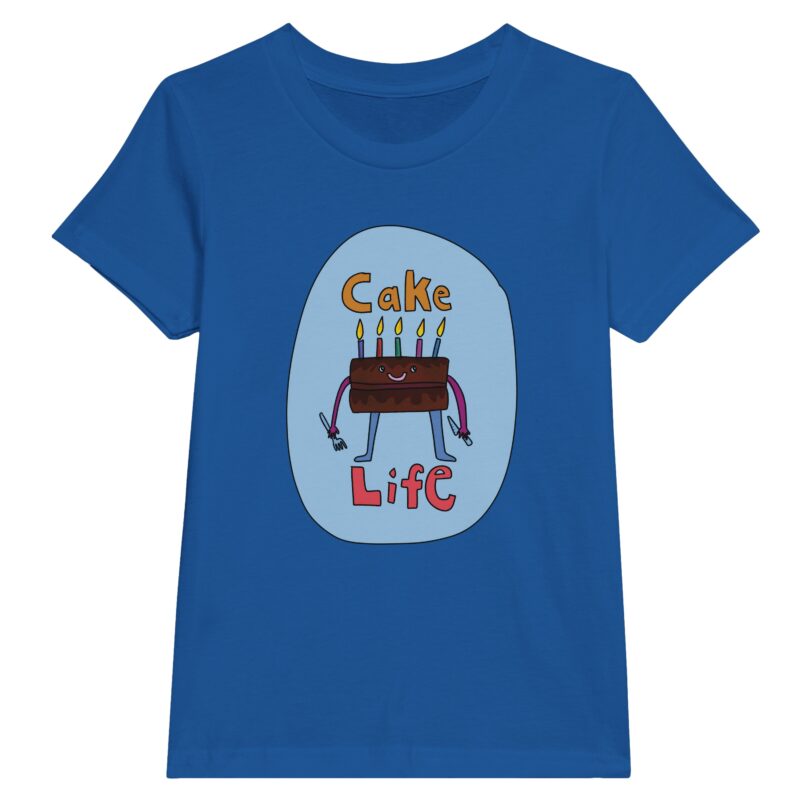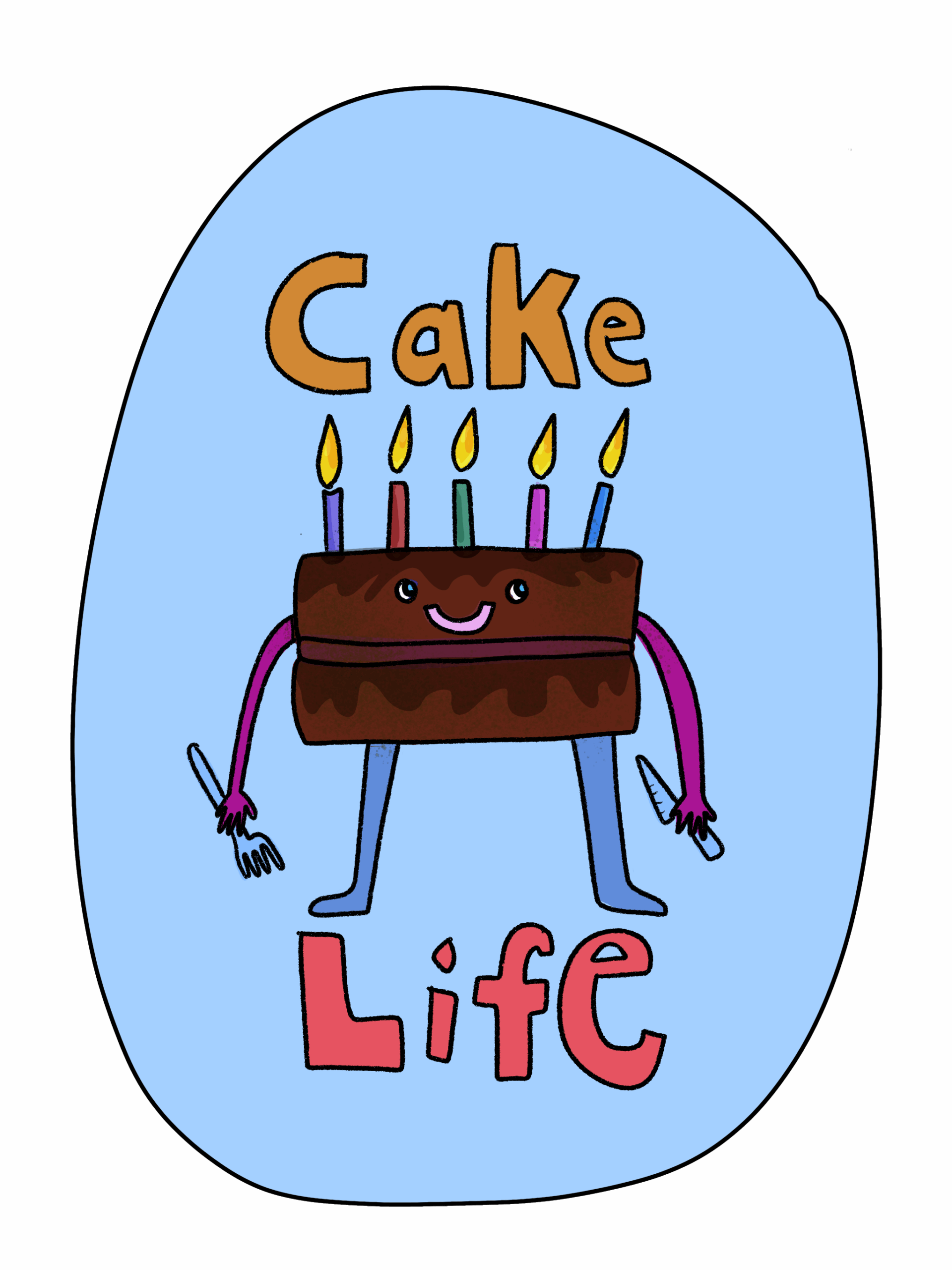 This one is special—a drawing by my 10-year-old, full of personality, humor, and love for dessert. It features a giant chocolate cake, fork and knife in hand, ready to party. Titled “Cake Life,” it captures that perfect mix of kid imagination and bold illustration.