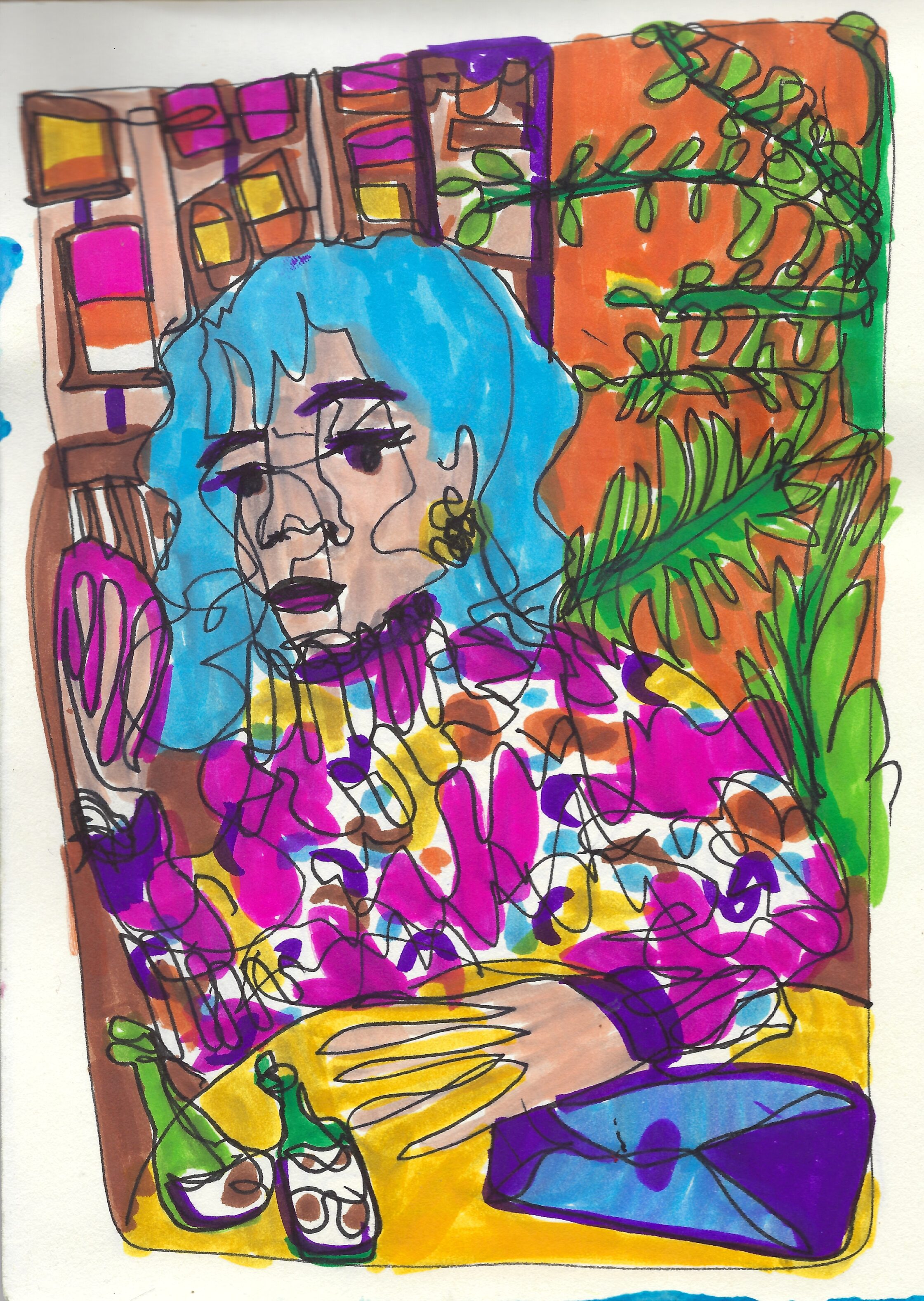 Blue Hair Woman A contour line drawing and brush marker pen portrait Share this: Click to share on X (Opens in new window) X Click to share on Facebook (Opens in new window) Facebook Strawberries and Baby Carrots Girl with Hearts and Squiggles