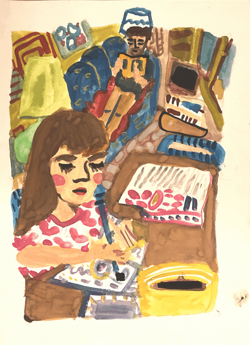 Drawing on the dining room table A gouache painting of an art session at the dining room table, during a rainy day at the lake. Share this: Click to share on X (Opens in new window) X Click to share on Facebook (Opens in new window) Facebook Potted Plants in the Rain Cat Girl with a Wild Cat painting