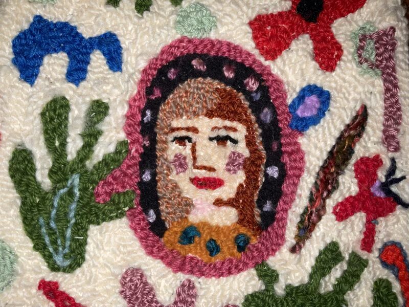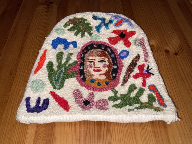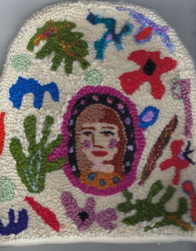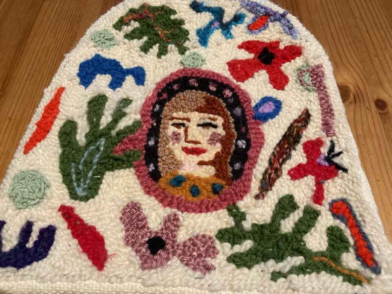 My first punch needle project, a portrait with abstract shapes and greenery around the central girl. I made it on a 10 x 10 frame